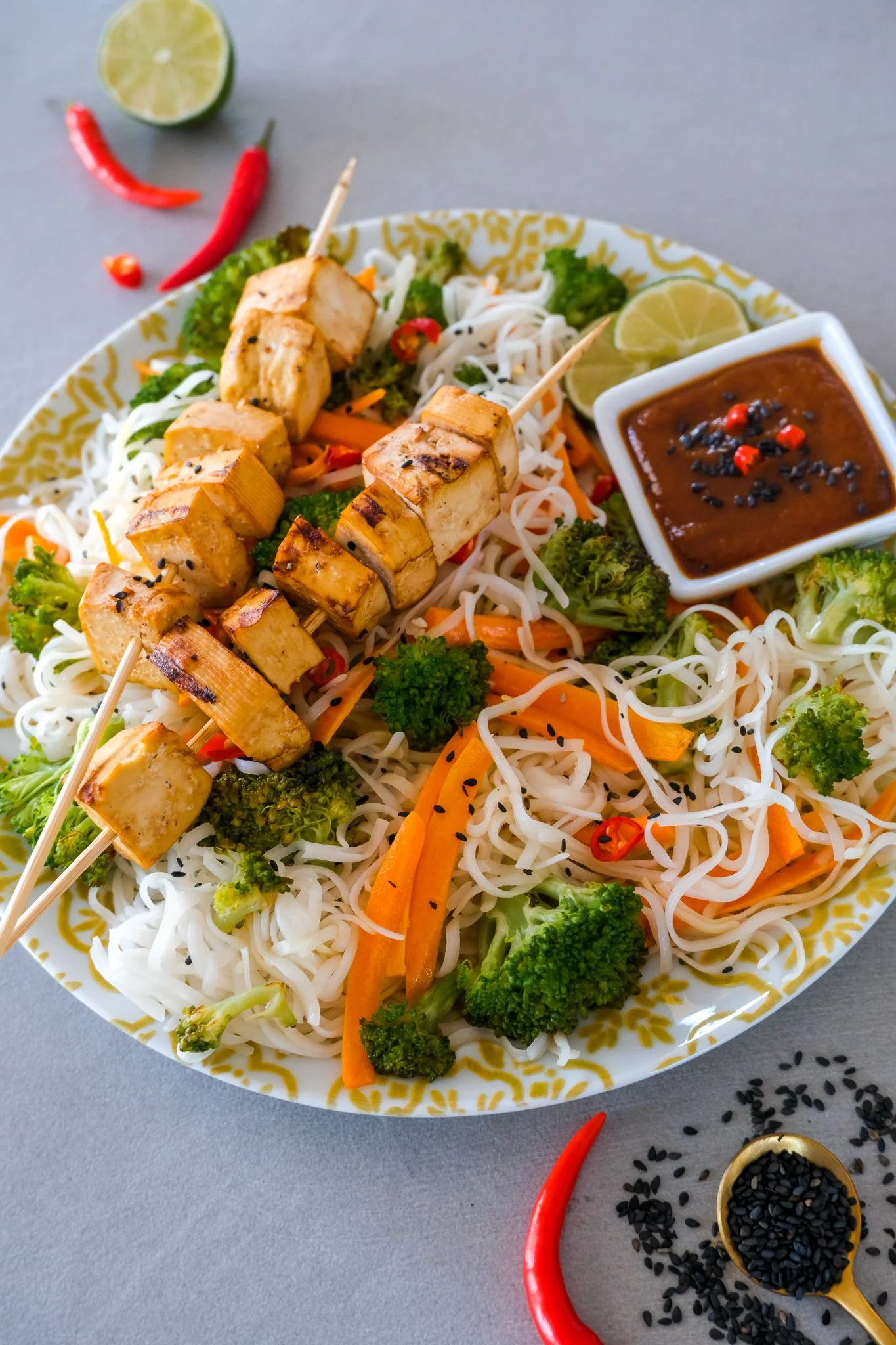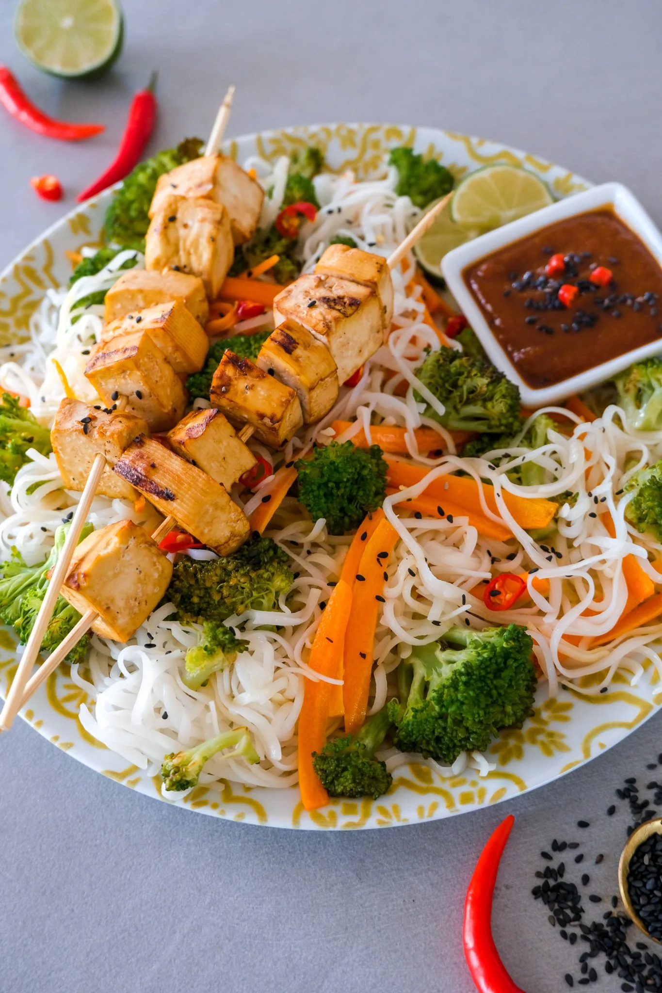 ASIAN TOFU BBQ SKEWERS WITH RICE NOODLES