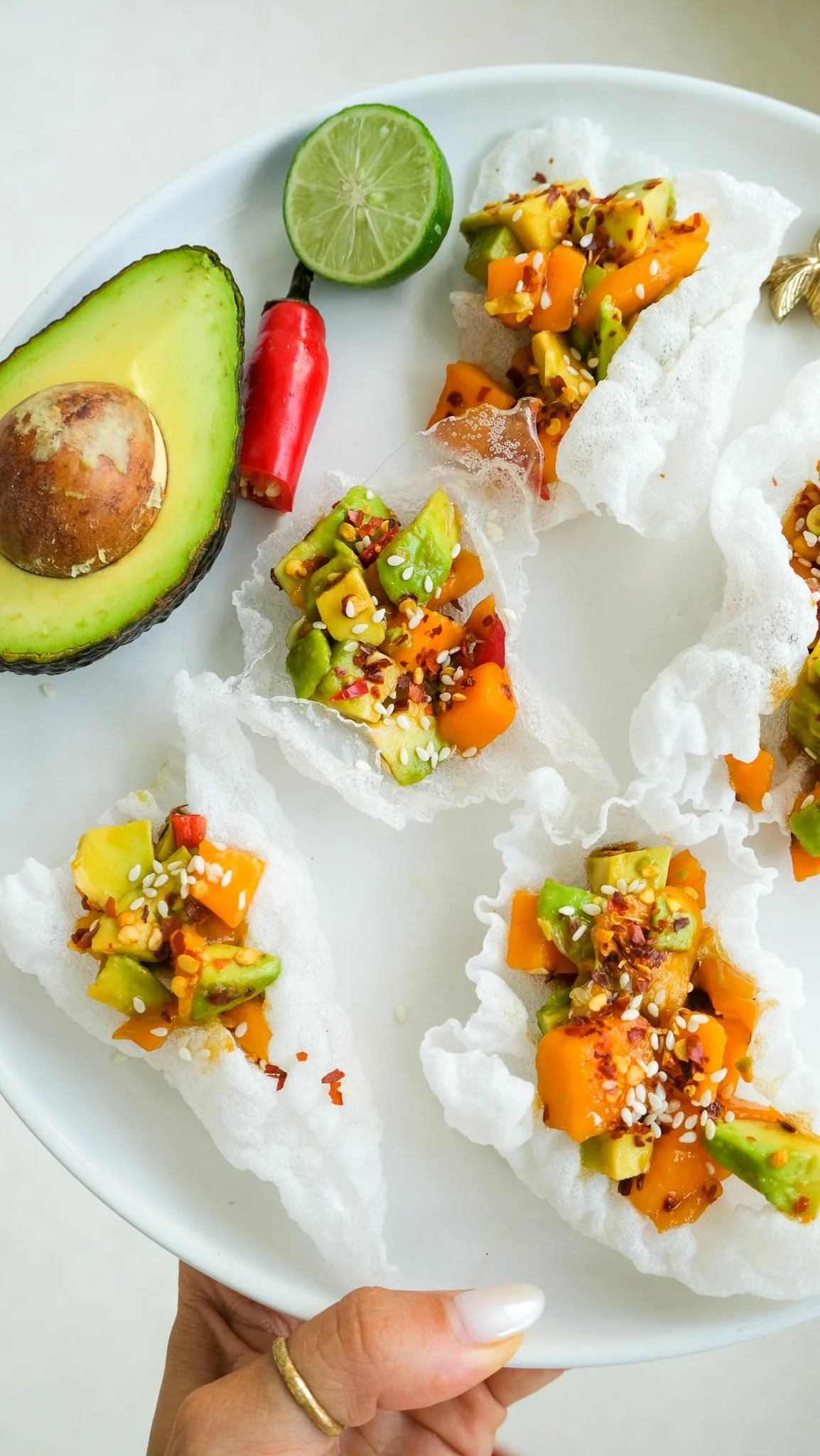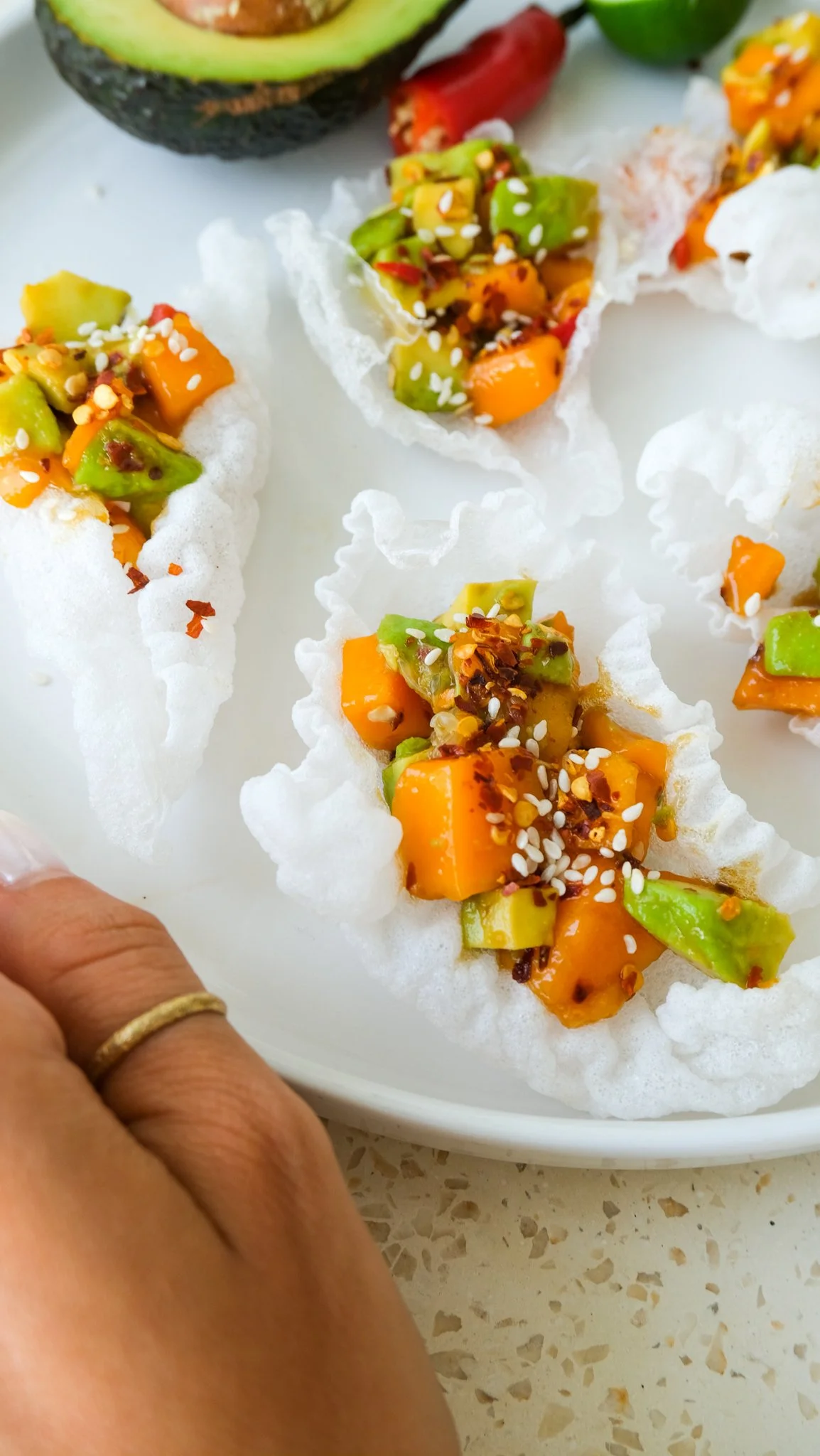 CRISPY RICE PAPER TOSTADAS WITH MANGO AVOCADO CEVICHE