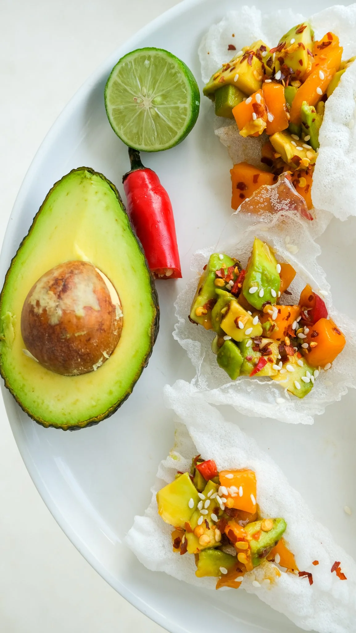 (German below) If you're looking for a light, fresh, and exotic vegan summer appetizer, these crispy rice paper tostadas with mango avocado ceviche are about to become your new favorite! With just a few simple ingredients like mango, avocado, lime juice, and soy sauce, combined with the magic of easily fried crispy rice paper, this tropical recipe brings a ceviche-inspired bite that's refreshing, vibrant, totally plant-based, gluten-free, dairy-free and ready in under 20 minutes.