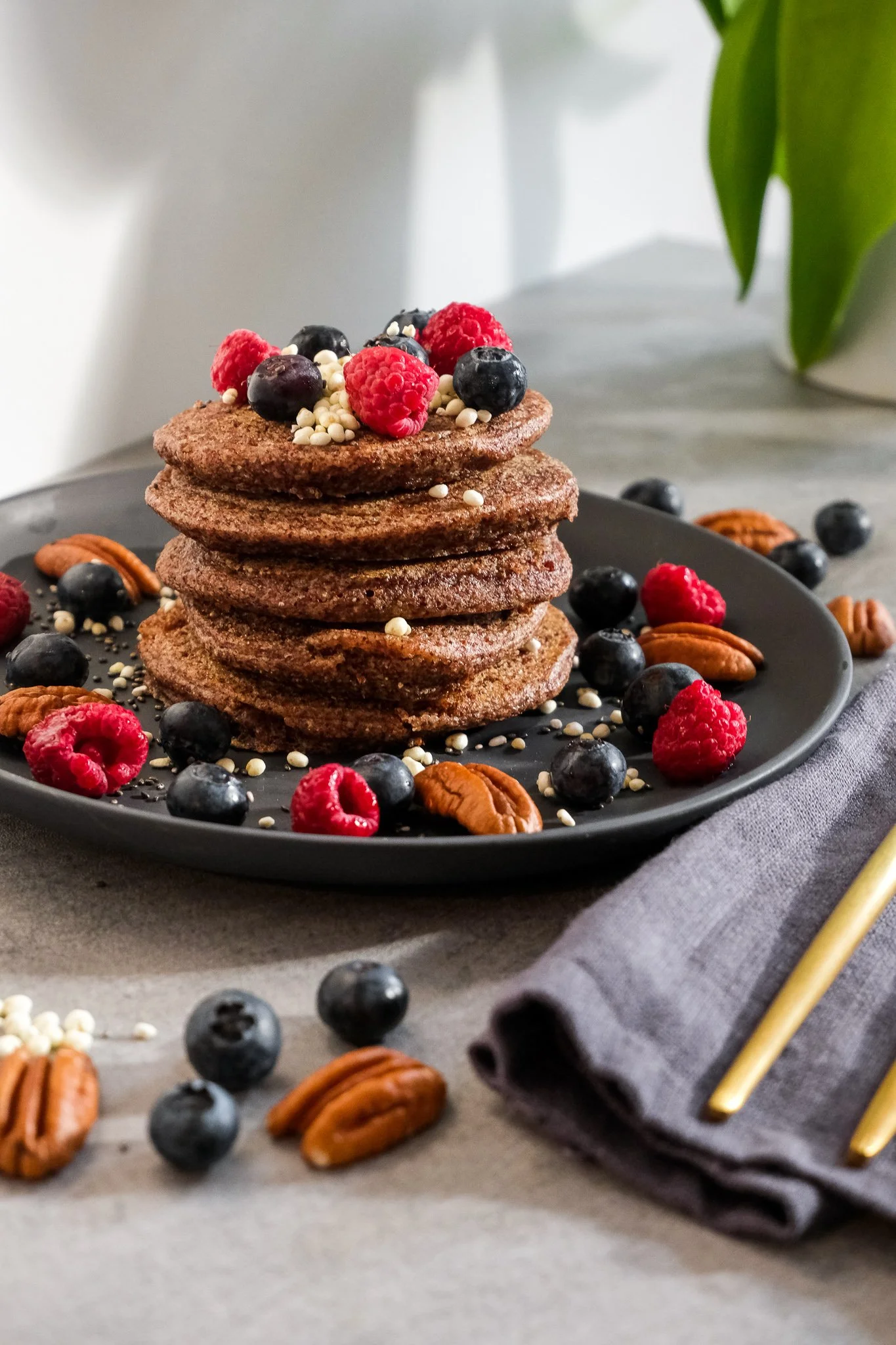 Garnish the pancakes as desired, I used berries, pecans, maple syrup, millet pops and chia seeds