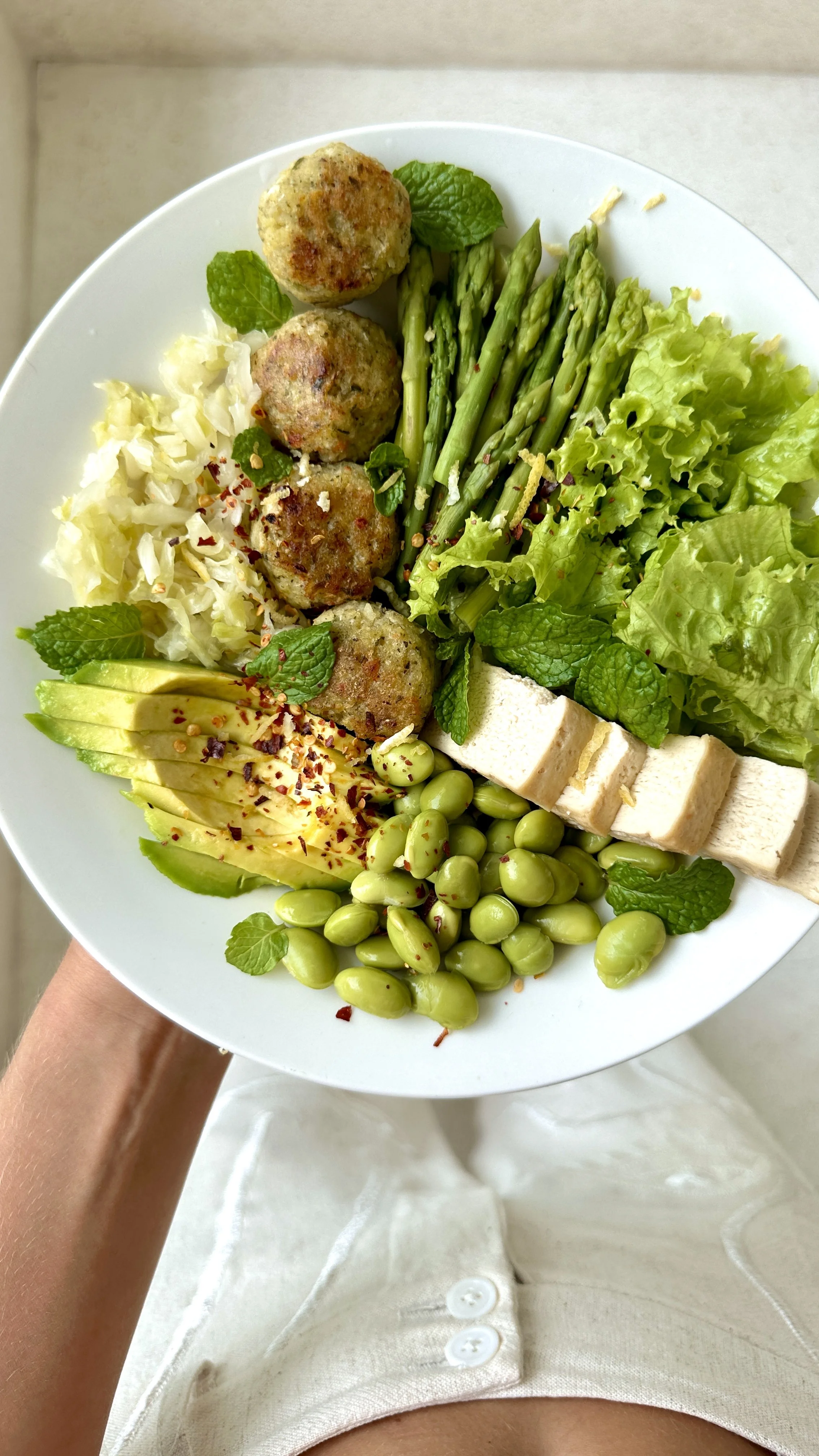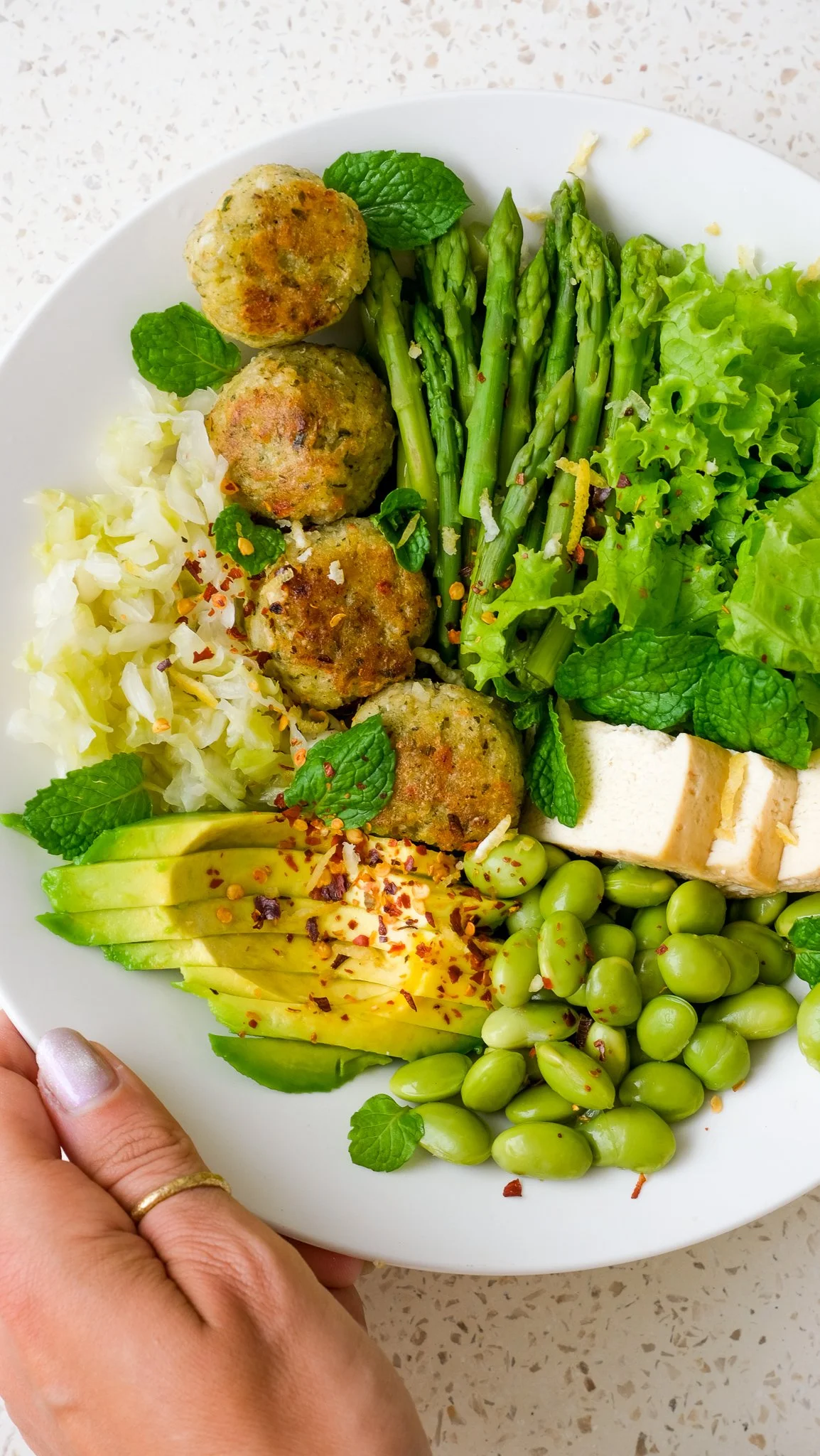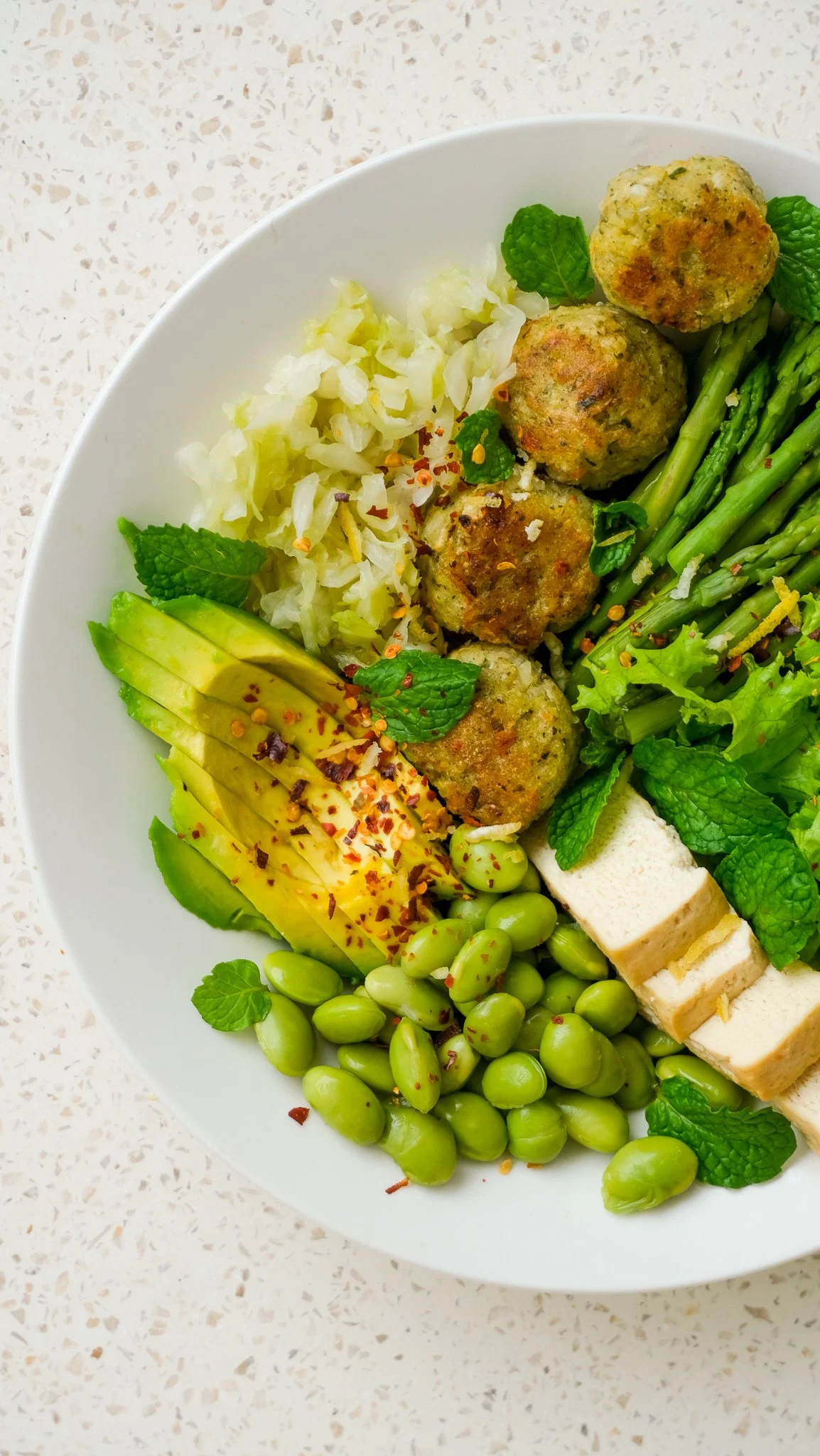 This bowl combines everything I love about spring dishes: tender green asparagus (finally back in season!), creamy avocado, crunchy edamame, and flavorful smoked tofu. The crispy falafel – packed with plant-based protein, make this bowl super satisfying. A spoonful of sauerkraut adds a tangy note and even gives a little gut-health bonus.