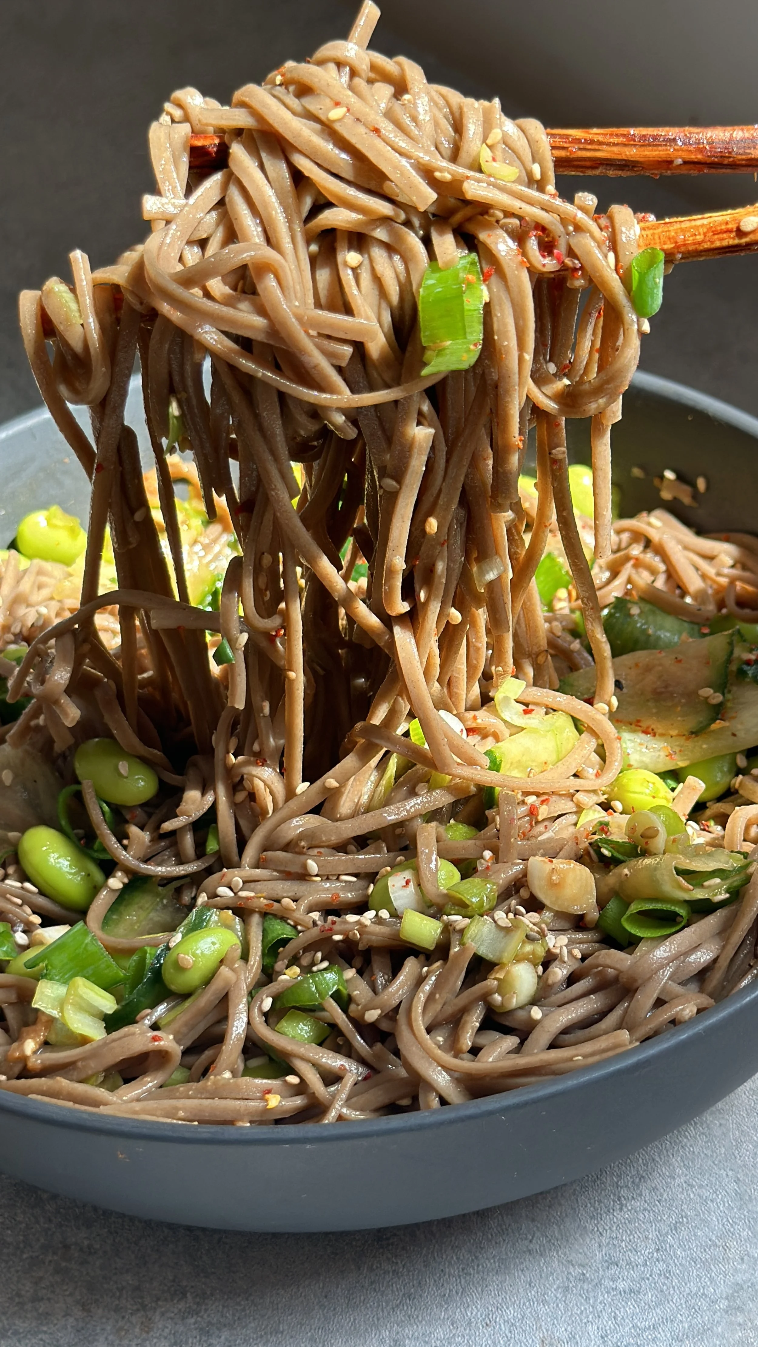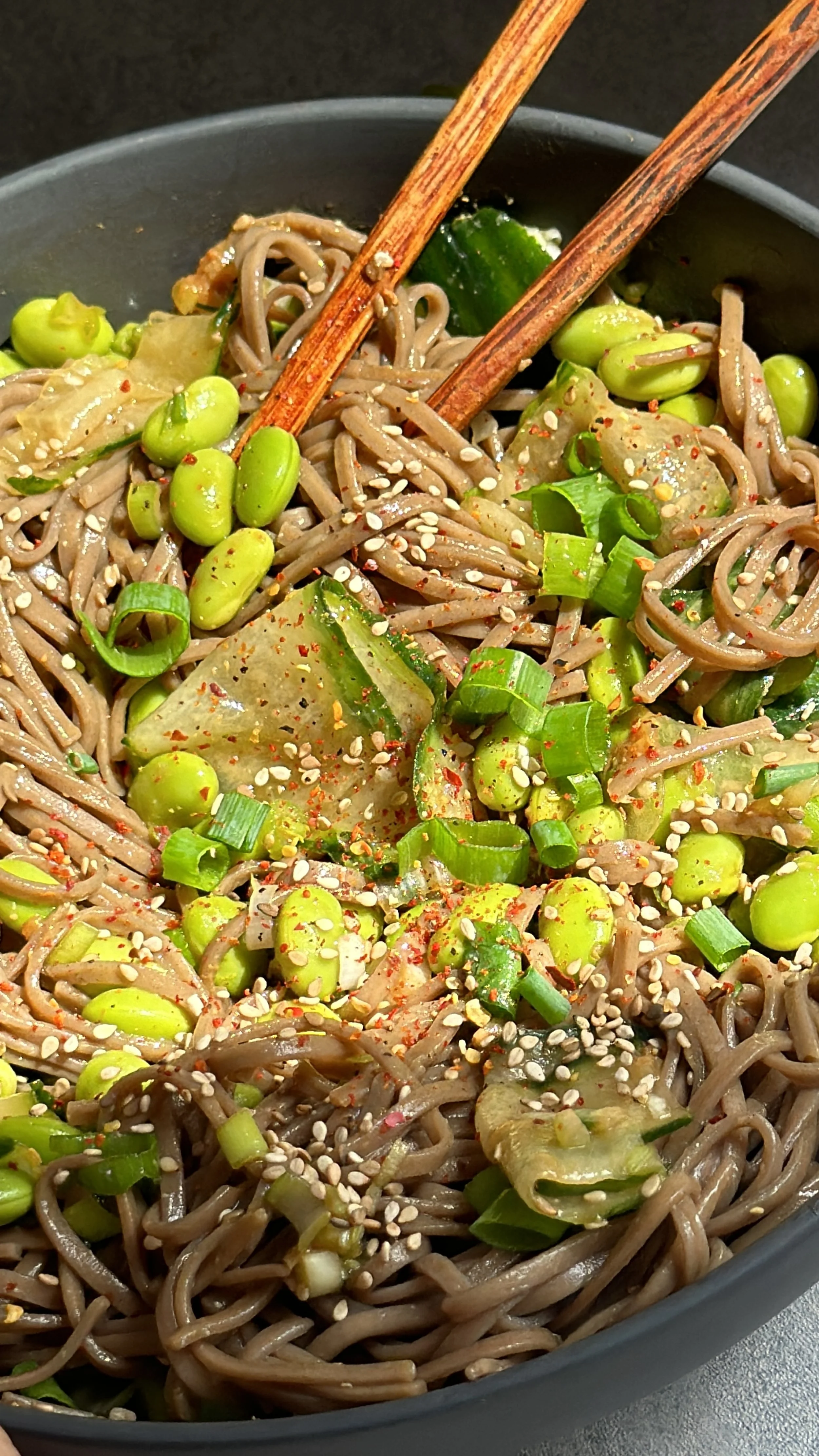 Besonders liebe ich den Kontrast in den Texturen: die seidigen Nudeln, die knackige Gurke, das angenehme Bissgefühl der Edamame und die leichte Nussigkeit von geröstetem Sesam. Jeder Bissen ist frisch und gleichzeitig wohltuend - wie Sommer in einer Bowl. 💚